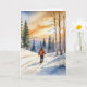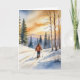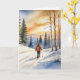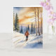 Ein Langläufer bewegt sich auf einem schneebedeckten Weg, umgeben von großen immergrünen Bäumen, unter einem pulsierenden Sonnenuntergang, der Himmel ist in Orange und Blau getönt. Inside Nachrichten können geändert werden.