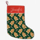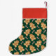 Dekorieren Sie Ihre Zuhause für die Ferien mit einem Weihnachtsfest Strumpf, das gut genug zum Essen aussieht! Der Strumpf zeigt Ihren Namen oben in einem weißen Kalligraphieskript mit rotem Hintergrund. Der personalisierte Weihnachtsmann-Strumpf zeigt ein Muster gemalter Lebkuchenmänner mit roten und weißen Bonbons vor dunkelgrünem Hintergrund.
