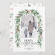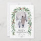 Weihnachts Mistletoe Foto Rustikale Urlaubskarte. Schöne Weihnachtskarte mit einem Bogen mit einem Foto gepaart mit handgemalten, wasserfarbenen roten Beeren und Wintergartenkranz. Blätter und Beeren botanisches Weihnachtsmuster im Hintergrund der Einladung.