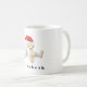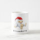 Eine Kaffee-Tasse mit einer Illustration eines niedlichen kleinen Weihnachtsschneemonsters, Spielzeug-Puppe, die eine rote Weihnachtsmannmütze trägt. Die kleine Schneekreatur hat eine Pull-Kette, um ihn reden zu lassen, und er ist mit weichem, weißem Fell mit hellbraunen Akzenten bedeckt.