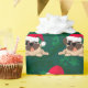 Niedlicher kleiner, individueller Mops Hund in Weihnachtsmannmütze.auf einem gemusterten Hintergrund.