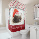 Ein Duschvorhang mit einem hübschen Foto eines Mops Welpen, der bei einer Weihnachtsmannmütze schläft. Fröhliche Weihnachten ist auf der Hutband geschrieben, in einem trendigen handgeschriebenen Schriftart. Eine Grunge-Grenze mit bunten Weihnachtsbeleuchtung umschließt den Rahmen dieses niedlichen Fotos. Der Hintergrund ist ein festliches, von Zuckerrohr gestreiftes Muster in rot-weiß und grün. Am unteren Rand steht ein individualisierbarer Text: Peace Joy und Mops.