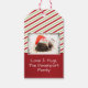 Ein Geschenktag mit einem hübschen Foto eines Mops Welpen, der beim Tragen einer Weihnachtsmannmütze schläft. Fröhliche Weihnachten ist auf der Hutband geschrieben, in einem trendigen handgeschriebenen Schriftart. Eine Grunge-Grenze mit bunten Weihnachtsbeleuchtung umschließt den Rahmen dieses niedlichen Fotos. Der Hintergrund ist ein festliches, von Zuckerrohr gestreiftes Muster in rot-weiß und grün. Personalisieren Sie mit Ihrem Namen. In der Signatur steht: Liebe und Mops, mit deinem Namen.