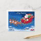 Eine skurrile Weihnachtspostkarte mit dem Weihnachtsmann, der in seinem roten Schlitten durch den Nachthimmel fliegt, voller farbenfroher Geschenke, während sein Rentier den Weg über ein schneebedecktes Dorf führt. Diese fröhliche und spielerische Illustration vereint den Geist von Heiligabend, perfekt um festliche Grüße an Freunde und Familie zu senden.