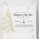 Eine elegante Weihnachts- und Neujahrsfeier mit einem luxuriösen Goldschmuck, silbernen Schneeflocken und festlichen Ornamenten auf weißem Hintergrund. Ideal für Ansammlungen, Familienfeiern und Neujahrsfeiern. Das Kartendesign verbindet Eleganz mit saisonaler Wärme und schafft eine fröhliche und einladende Atmosphäre für Ihre Gäste.