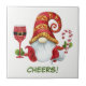 Diese festliche Keramik-Kachel zeigt ein niedliches Bild eines Gnomen-Elfs, der in einer Weihnachtsmannmütze mit roten und goldenen Rentiermustern gekleidet ist. In der einen Hand hält er ein Weinglas des Weihnachtsmanns und in der anderen ein rot-weiß gestreiftes Bonbon. Unten befindet sich ein benutzerdefiniertes Textfeld, in dem Sprichwort Cheers! in passendem Grün angezeigt wird.