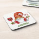 These fun drink coasters feature a cute image of a gnome dressed in a red and gold reindeer pattern Santa hat. He holds a Santa Claus wine glass in one hand und a red and white striped candy cane in the other. At the bottom is a custom text field, which is shown saying cheers! in matching green.