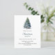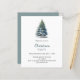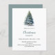 Eine Wintereinladung für ein Weihnachtsfest im Party. Ein weißer Hintergrund auf der Vorderseite mit einem von Hand gezeichnet, wasserfarbenen Kiefernbaum mit Schnee. Personalisieren Sie Ihre Party-Daten und fügen Sie sie hinzu. Zurück: blaugrüner Hintergrund. 1 Blatt = 1 Einladung mit Druckkante bis Kante.