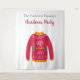 Ein Wandteppich für eine lustige Urlaubssaison und Weihnachten Party, Abendessen. Ein schick weißer Hintergrund. Die Dekoration ist mit einem üppig roten, weißen, orangen und grünen Weihnachtspulli verziert. Personalisieren und fügen Sie Ihren Familiennamen, schwarze Buchstaben. Der Text: Weihnachts-Party ist rot geschrieben mit einem modernen handgeschriebenen Schriftsatz. Kann als Begrüßungsschild, Party-Wanddekoration oder als Foto-Standfläche verwendet werden.