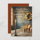 Eine festliche Save the Date-Karte für eine Weihnachts- oder Feiertagsparty mit einem rustikalen Tisch mit Kerzen und einem Weihnachtskranz mit glitzernden Lichtern. Wunderschön für Familien- oder Firmenfeiern oder für ein offenes Haus.