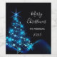 Ein trendiger und moderner Weihnachtswein-Label für das Party in Schwarz, Blau und Weiß. Ein schwarzer Hintergrund mit einem glänzend blauen Weihnachtsbaum, der mit Sternen geschmückt ist. Mit dem Text: Frohe Weihnachten geschrieben mit modernen und trendigen großen weißen Handschrift Schreibschrift im Stil. Vorlagen für Ihren Familiennamen und ein Jahr.