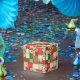 Eine Hütte mit Weihnachtselementen, wie dem Weihnachtsmann, Heiligen und Schneeflocken in Rot, Grün und Weiß, macht eine niedliche Geschenkboxen, die perfekt für Ihre Urlaubsgeschenke ist.