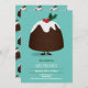 Eine Weihnachts-Pudding Charakter-Einladung mit aquamarinem Hintergrund. Die Wörter sind weiß und grün und können individuell angepasst werden.
