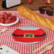 Weihnachts Red Santa Party Paper Teller. Ein lustiges Design für Ihre Feierlichkeiten. Ein hellroter Hintergrund mit einem goldenen Gürtelschnalle auf einem Ledereffekt schwarzer Gürtel. Ich wage zu behaupten, dass der Weihnachtsmann ein schwarzer Gürtel im Geschenk ist!