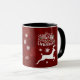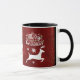 Diese gemusterte Tasse kann mit Ihrem Monogramm oder Namen personalisiert werden. Die typisch nordische Typografie zeichnet sich durch einen sprunghaften Hirsch und Schneeflocken auf bordeauxrotem und goldgesprenkeltem Hintergrund aus. Texttypografie heißt "Frohe Weihnachten".