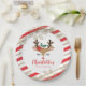 Weihnachts-Rentiermädchen Geburtstagsparty Teller mit niedlichen Rentiergesicht und Goldenen Schneeflocken und Rot und Gold Glitzer Streifen.