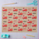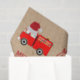 Eine niedliche Abbildung eines roten Feuerwehrwagens mit einer Weihnachtsmannmütze und in Weihnachtsbeleuchtung auf einem kraftbraunen Papier im Hintergrund. Der bezaubernde rote Motor eilte raus, um ein Feuer zu löschen. Perfektes Geschenk für jeden und jedes Alter. Ein absolutes Lieblingsfahrzeug für Notfälle. Passen Sie den Namen an und machen Sie ihn zu Ihrem eigenen.