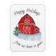 Die Aquarellszene bietet eine rote Scheune mit Weihnachtsbeleuchtung und dekoriertem Baum und "Happy Holidays from our Zuhause to your" mit individualisierbarem Text