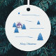 Dekorieren Sie Ihren Weihnachtsbaum mit diesem Ornament! Es kommt mit einer schneebedeckten Landschaft in einem Aquarell-Stil mit Tannen und einem lila Haus und dem Text Frohe Weihnachten!