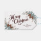Dieses Weihnachtsgeschenk-Tag zeigt den Begriff "Frohe Weihnachten" in einem großen, eleganten Script-Schriftart, der in einer dunkelburgundischen Farbe erscheint. Die Ecken des Tags sind mit einer winterlichen botanischen Anordnung dekoriert, die Kiefernzapfen, Tannenfäden, sanfte Tannen und aquamarines Laub umfasst, was ihm ein gemütliches Urlaubsatmotiv verleiht. Personalisieren Sie dieses elegante Geschenketikett mit Ihrem Namen.