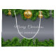 Ein silbernes Imitat mit grüner Kiefer und Imitaten goldene Weihnachtsornamente als Dekoration. Mit dem Text: Frohe Weihnachten geschrieben mit einem modernen handgeschriebenen Stil Skript. Vorlage für Ihren Familiennamen, weiße Buchstaben.