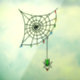 Niedliche und graue Zierspinne hängt von seinem Eckband mit einem Ornament. Das Spinnennetz ist mit hellen Weihnachtslichtern bedeckt. Große Drehung auf einem traditionellen Urlaubsbild, von Briana Blair.