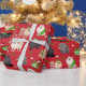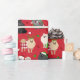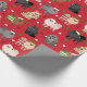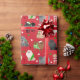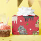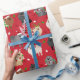 Niedliche Weihnachtshunde in festlichen Urlaubssälen. Spitze mit cremefarbenen, schwarzen, bräunlichen, grauen und schokoladenbraunen Mäntel tragen Weihnachtsmannmützen, Geweihe, Pullover auf rotem Hintergrund mit verstreuten Ziermustern.
