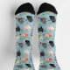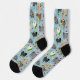 Niedliche Weihnachtshunde in festlichen Urlaubssoutien. Spitze mit cremefarbenen, schwarzen, bräunlichen, grauen und schokoladenbraunen Mäntel tragen Weihnachtsmannmützen, Geweihe, Pullover auf blauen Untergrund mit verstreuten Ziermustern.