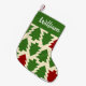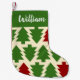 Vintage Weihnachtsbaumen bedecken die Vorderseite dieses maßgeschneiderten Strumpfs. Fügen Sie den Namen Ihres Lieblingselfs zu dieser essenziellen Weihnachtsdekoration hinzu. Kieferngrün und Weinfarben sind die Farbtupfer der Saison.