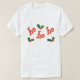 Ein weißer T - Shirt mit "ho ho ho ho ho" in roten und goldenen Buchstaben und heilig, aus einem handgemalten Papier Collage Design von Judy Adamson. Dieses Design ist auch als Weihnachtskarte und auf Geschenken und Kleidung erhältlich.