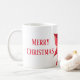 Diese Keramik Kaffee-Tasse wird mit einem festlichen Feiertag rot poinsettia Print gezeigt. Text: Frohe Weihnachten