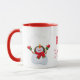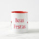 Keramik Kaffee/Tee/Kakao Tasse wird mit einem festlichen Weihnachtsschneekunstdruck mit "Boas Festas" im Text gezeigt. Schneemann druckt auf beiden Seiten der Tasse. Passen Sie dieses Objekt an oder kaufen Sie, wie es ist.
