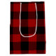 Der braune Teddybär hing an Weihnachtsbeleuchtung auf rotem und schwarzem Büffel karierten Hintergrund. Text ist bearbeitbar.