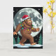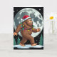 Verbringen Sie Ihren Urlaub mit einer bezaubernden Weihnachtsgrüßkarte mit einem lieblichen Cartoon Bigfoot in einer festlichen roten Weihnachtsmannmütze 🎅 🏼. Diese bezaubernde Kreatur geht vor einem riesigen grauen Mond, der in bunten, bunten Weihnachtslichtern 🌕 🎄 umhüllt ist. Mit seinem braunen Fell, den nackten Füßen und dem fröhlichen Ausdruck wird dieser Bigfoot jedem ein Lächeln ins Gesicht bringen. Der Text der Karte wird in pfiffiger Form auf schwarzem Hintergrund platziert, unten stehen Silhouetten immergrüner Bäume. Mit dieser Karte, die den Zauber der Saison einfängt, verteilen Sie ein paar Feiertagssjubeln! 🎁