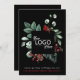 Elegante schwarze Weihnachtsgrüßkarte mit Ihrem Firmenlogo, gerahmt von einer naturlich inspirierten Aquarell eines roten Kardinals und saisonalen Wintergrün. Personalisieren Sie Ihre Weihnachtsgrüße und Ihren Firmennamen in einfacher rot-weißer Typografie.