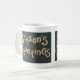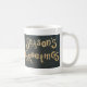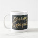 Eine stilvolle, weiße Kaffeemaschine mit "Season's Greetings" auf schwarzem Hintergrund in Gold und Silber-Schrift, von einem handbemalten Design von Judy Adamson. Eine passende Grußkarte ist ebenfalls verfügbar.