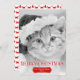 Heilige Weihnachten knuddelige rot-weiße Katze Haustier Weihnachtsfotokarte mit Ihrem Text in einem roten Rahmen. Auf der Rückseite befinden sich Katzen- und Baummuster in Rot und Weiß.