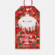 Ein weiße Weihnachtsschmuck mit einer Silhouette Weihnachtsmann und seinem Schlitten, immergrünen Bäumen, den Worten Frohe Weihnachten und deinem Familiennamen in schicker Schrift sind auf einem abstrakten Urlaubsmuster Hintergrund zu diesen Gunsten oder Geschenkmarken dargestellt.