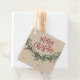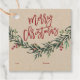 Ein festliches, rot, grün und weiß fröhliches Weihnachtsgeschenk-Tag mit kühlem Schrift und Aquarell-Grün mit Blätter und Beeren auf weißem Hintergrund.