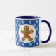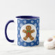 Diese WeihnachtsTasse stellt einen Lebkuchenmann dar, der durch ein Muster der Schneeflocken auf einem blauen Hintergrund umgeben wird. Es ist ein netter Zusatz zu Ihrem Zuhause oder zu Büro.
