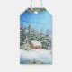 Fügen Sie Ihren Geschenken ein friedliches Weihnachtswunder mit festlichen Aquarellmarken hinzu. Eine schneebedeckte Hütte liegt im Wald zwischen den Bäumen, und das Grün des Urlaubsortes rundet das Bild ab.