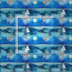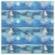 Aquamarine, dunkelblaue und hellblaue Winterlandschaft mit Rentieren, heller Sonne, Weihnachtsdekoration und einem Schneemann wiederholen Design