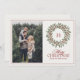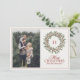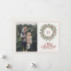 Elegante Weihnachtsfotokarte mit einem festlichen Weihnachtskranz mit einem individuell anpassbaren Monogramm in der Mitte und dem klassischen roten Drehbuch "Frohe Weihnachten". Auf der Rückseite ist Platz für Feiertagsgruß vorhanden - Sie können die Standardnachricht behalten, Ihre eigene schreiben oder ganz entfernen, um ein minimalistisches, rein frontales Design zu erhalten. Ein zeitloser Weg, warme Weihnachtswünsche mit Familie und Freunden zu teilen.