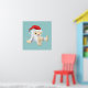 Eine niedliche Yeti-Puppe mit einer roten Weihnachtsmannmütze und ist dabei, sich hinzusetzen. Die Puppe ist zornig und weiß mit beigen Akzenten. Die Puppe hat eine Zugschnüre im Rücken, damit er reden kann. Hintergrund ist eine Retro-grüne Farbe.