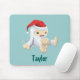 Ein festliches Mousepad mit einer Illustration eines niedlichen kleinen Weihnachtsyeti, Spielzeug-Puppe, die eine rote Weihnachtsmannmütze trägt. Der kleine Yeti hat eine Pull-Kette, um ihn reden zu lassen, und er ist mit weich weißem Fell mit hellbraunen Akzenten bedeckt. Hintergrund ist eine Retro-grüne Farbe. Persönlich mit einem Namen in einem fröhlichen grünen Schriftart.
