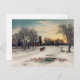 Eine Winterlandschaft vereint eine ruhige Landschaft mit einem Pferd gezeichnet Schlitten, der durch eine schneebedeckte, von Bäumen gesäumte Dorfstraße gleitet. Im Hintergrund steht eine Kirche unter einem Halbmond in einem lebendigen Sonnenuntergangshimmel.