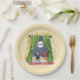 Papier Teller mit einem skurrilen Aquarellbild. Ein kleines Kind im Schlafanzug und ihre Katze als Haustier schauen am Heiligabend aus ihrem Fenster. Der Weihnachtsmann und seine Rentiere fliegen in Silhouette über den Nachthimmel, und ein großer Vollmond beleuchtet ihren Weg.
