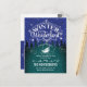 Mit dieser Vintag inspirierten Postkarte laden Sie Ihre Weihnachts-Party-Gäste stilvoll ein. Diese Designvorlage hat einen Hintergrund eines dunkelblauen Nachthimmels mit funkelnden Sternen und grünen Kiefernbäumen und dekorativer weißer Schriftzeichen-Typografie, die "Winter Wonderland" lautet. Unten ist ein weißer Schlitten mit all Ihren Party-Details für Sie personalisieren. Auf der Rückseite der Postkarte gibt es einen Bereich für weitere Party-Details zum Abendessen, damit Sie es individuell gestalten können. Gute Ferien!