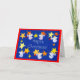 Eine helle und festliche Weihnachtskarte mit sechs kleinen weißen Engeln, die die Sterne in der Weihnachtsbereitschaft polieren, aus einer handbemalten Papierkollektion von Judy Adamson. Der Gruß auf der Vorderseite, in weißer Schrift auf tiefblauem Hintergrund, ist "Frohe Weihnachten" und das Innere ist für Ihre eigene Botschaft leer verlassen.