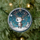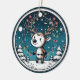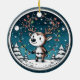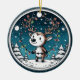 Mit dieser bezaubernden Illustration eines fröhlichen Rentiers, der spielerisch in farbenfrohen Weihnachtslichtern verstrickt ist, erleben Sie die skurrile Magie der Ferien. Set gegen einen sternförmigen Nachthimmel mit schneebedeckten Kiefern und einem leuchtenden Halbmond strahlt dieses kreisförmige Design gemütliche Winterfreude aus.